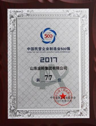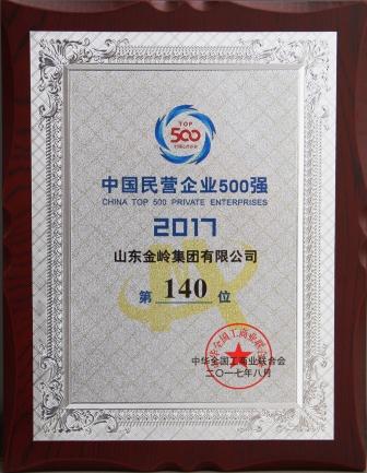 2017年8月24日,全國工商聯與山東省政府聯合舉辦的“2017年中國民營經濟500強發布會暨民營經濟發展峰會”在濟南舉行,會議發布了2017中國民營企業500強榜單,我公司再次入圍,位列中國民營企業500強第140位,中國民營企業制造業500強第77位。