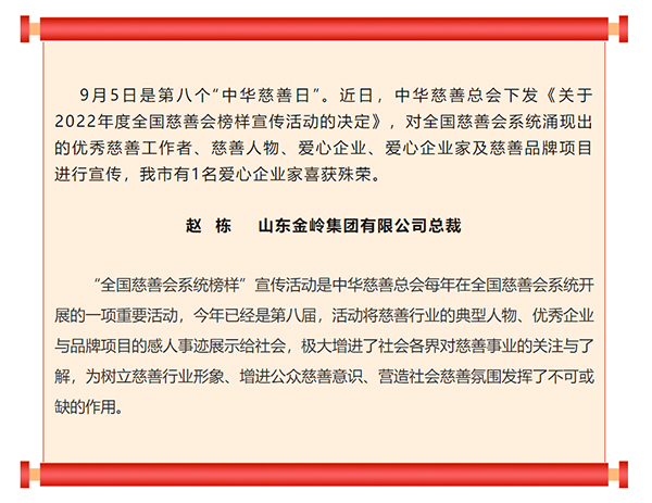 2023年9月5日是第八個“全國慈善會系統(tǒng)榜樣”宣傳活動暨第八個“中華慈善日”,中華慈善總會下發(fā)《關(guān)于2022年度全國慈善會榜樣宣傳活動的決定》,對全國慈善會系統(tǒng)涌現(xiàn)出的優(yōu)秀慈善工作者、慈善人物、愛心企業(yè)、愛心企業(yè)家及慈善品牌項目進(jìn)行宣傳,金嶺集團(tuán)總裁趙棟喜獲“全國慈善會系統(tǒng)榜樣”稱號。