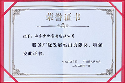 2024年1月19日,在廣饒縣委、縣政府召開的全縣新型工業(yè)化推進大會上,山東金嶺集團有限公司被授予“服務(wù)廣饒發(fā)展突出貢獻獎”榮譽稱號,以表彰公司對地方經(jīng)濟發(fā)展做出的突出貢獻。