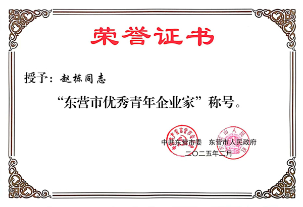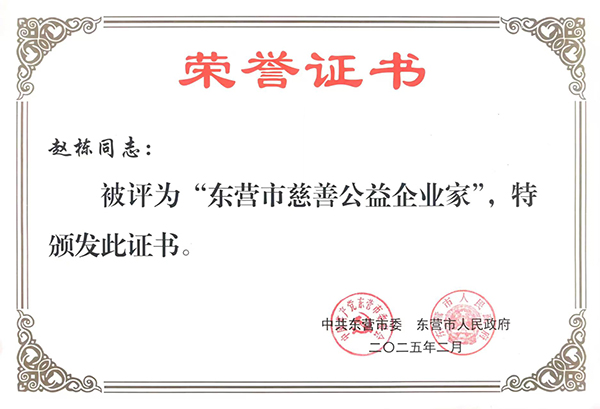 2025年2月10日,東營市優秀企業和企業家表彰大會召開,集團公司被評為“2024年度東營市納稅突出貢獻企業”,總裁趙棟被授予“東營市優秀青年企業家”“東營市慈善公益突出貢獻企業家”榮譽稱號。