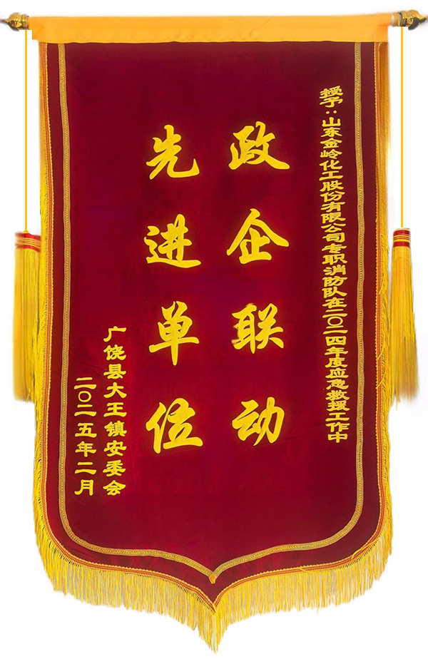 2025年3月12日,為表揚山東金嶺化工股份有限公司專職消防隊積極響應政企聯動機制,在應急救援工作中做出的突出成績,廣饒縣大王鎮安委會授予公司“政企聯動先進單位”錦旗。