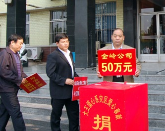 四川地震災情牽動著每一個金嶺人的心,災情發生后公司向全體員工發出了“一方有難,八方支援”向災區捐款的倡議,并于5月18日在辦公樓前舉行了“心系災區、愛心奉獻”抗震救災捐款儀式,大家紛紛伸出援助之手,僅一天時間就捐款50萬元,其中董事長趙曰嶺捐款25萬元,向災區人民奉獻上金嶺人的一片愛心。