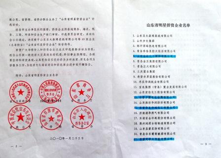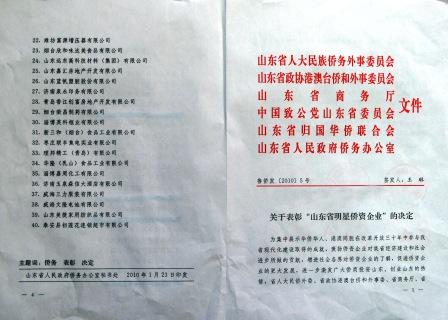近日,我公司作為僑資企業被國務院僑務辦公室評為“全國百家明星僑資企業”,被山東省僑辦、省人大民僑外委、省商務廳、省政協港澳臺僑和外事委、省致公黨、省僑聯評為“山東省明星僑資企業”。在40家受表彰的山東省明星僑資企業中, 我公司排名第5位。