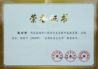 5月23日至24日,2010年全國企業家活動日暨中國企業家年會在湖南長沙舉行,會議揭曉我國企業界最高獎項——“全國優秀企業家”獎并舉行表彰儀式,公司董事長趙曰嶺榮獲“全國優秀企業家”稱號?! ?/DIV>