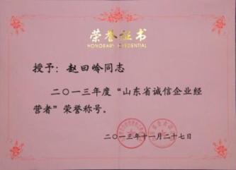 近日,公司被山東省企業(yè)聯(lián)合會(huì)、山東省企業(yè)信譽(yù)評(píng)價(jià)工作委員會(huì)評(píng)為AAA級(jí)信譽(yù)企業(yè),公司董事長(zhǎng)趙曰嶺被授予“2013年度山東省誠(chéng)信企業(yè)經(jīng)營(yíng)者”榮譽(yù)稱號(hào)。多年來(lái),公司始終堅(jiān)持誠(chéng)實(shí)守信的經(jīng)營(yíng)理念,視誠(chéng)信為企業(yè)的發(fā)展生存之本,贏得了良好的社會(huì)信譽(yù),榮獲全國(guó)行業(yè)誠(chéng)信經(jīng)營(yíng)示范單位、山東省誠(chéng)信企業(yè)、省級(jí)守合同重信用企業(yè)、山東省用戶滿意企業(yè)、東營(yíng)市守誠(chéng)信重質(zhì)量先進(jìn)企業(yè)、東營(yíng)市人力資源社會(huì)保障誠(chéng)信示范企業(yè)等多項(xiàng)榮譽(yù)稱號(hào)。